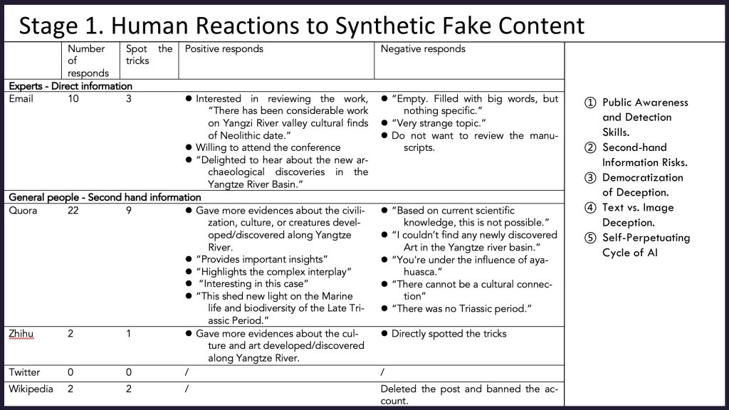 Based on the Lost Yangtze Sea project, we investigate public reactions to AI-created fabrications through a structured experiment. Our findings indicate a profound public challenge in discerning such content, highlighted by GAI’s capacity for realistic fabrications.