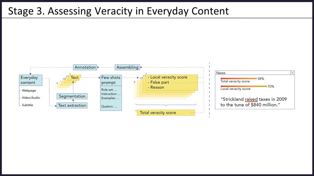 本项目一方面生成虚假内容以研究其传播动态,另一方面开发评估技术以减轻其影响。我们还提出了开发事实核查可穿戴设备的构想,比如投影式阅读眼镜或夹式设备。